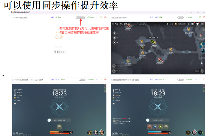 启用同步操作可大幅提升效率,一次最多同时操作四个窗口。