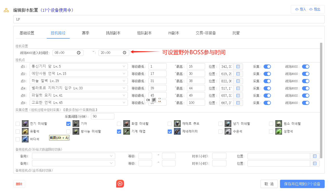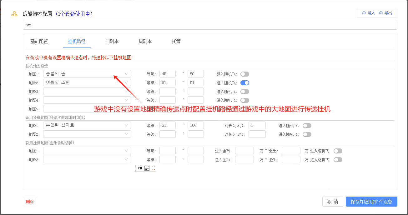 启动挂机功能 在游戏中没有设置地图精确传送点时,可以配置挂机路径进行挂机 通过游戏中的大地图进行传送